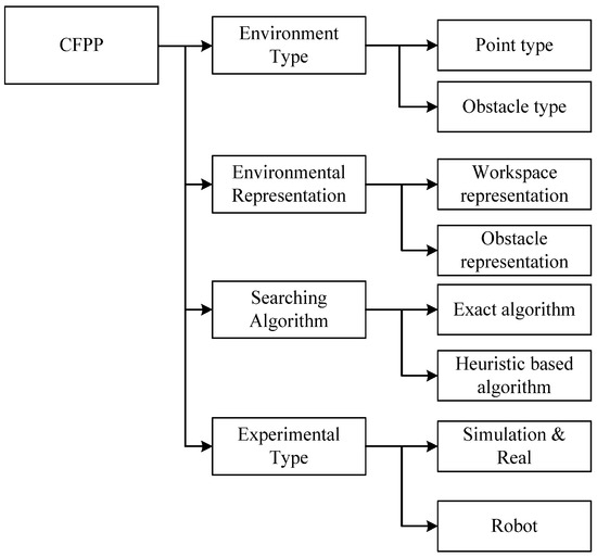 Researchers in different fields have conducted similar studies; hence, there are problems with regards to the definitions and terms. For example, some of the papers use the name of problems as mover’s problem [15], motion planning problem [16] or path planning problem [2]. Numerous methodologies are provided in the research while using different key words [5,13,17,18]. However, a comparison of methodologies is rarely studied. Previous research has focused on the different characteristics of the CFPP problem, such as sampling-based algorithm [19], or has used a very small number of searching algorithms [12]. On the other hand, researches have not focused on the differences in terminology and meanings. In the writers’ opinion, this lack of uniformity and conformity in terminology makes it difficult to select and decide on an appropriate algorithm. Therefore, the objectives of this study are as follows. First, the purpose of this research is to unify the name and attributes. Secondly, to provide a method to classify algorithms for solving the problem. Third, the performance of the algorithms for solving CFPP is measured within a fundamental environment. These contributions will enable researchers, who study the CFPP problem to grasp the key point in a problem. Finally, researchers will be better able to choose searching algorithms, through the comparison of the different algorithms.