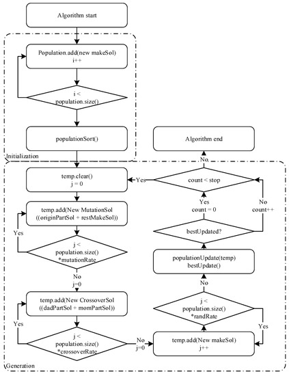 In Figure 4, flow of GA is divided into two parts: initialization and generation. The initialization part is initializing the GA’s population set, which is then improved in Generation part. The generation part has three methods: crossover, mutation, and random generation. Each new population set is generated through these methods and the next generations are updated based on the population set. The generation number is counted when the best solution is not updated and resets to zero when the best solution is updated. Executing a generation count completes the algorithm.
