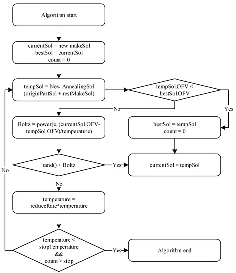 The flow of SA is shown in Figure 5. The algorithm has two different stop criteria; temperature and loop count. When a new solution in next loop fails the Boltzmann factor check, a pre-determined reduction rate reduces the temperature. When a new solution in next loop passes the Boltzmann factor check, the loop number is increased when the best solution is not updated. Again, as in Figure 4, the number is reset to zero when updating the optimal solution.