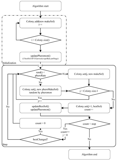 ACO flow has two steps, initialization and improvement step, as shown in Figure 6. Ant colony is initialized in the initialization using the same method used with other algorithms. In the improvement step, a solution will be generated in one of two ways. The first way is a pheromone concept and the other is a reusing method in Initialization step. Each link has its own probability and ants find a path following the probability in order to make pheromone concept. The link probability is added by the following equation.