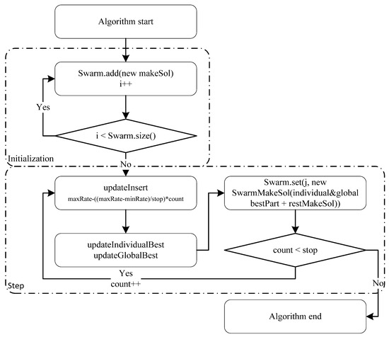 In Figure 7, flow of PSO is introduced as two parts: initialization and improvement step. The algorithm has a similar structure to that of ACO. However, instead of concept of pheromone, PSO uses a concept of inertia rate for mimicking the movement of swarm. Previous solutions are destroyed by the inertia rates and new solutions are rebuilt using the best solution and an overlapped method for making a new solution. A number for stopping criteria is counted by passing the loop and the number is set as zero, when the best global solution is updated.