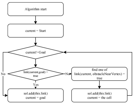 A method for making a new initial solution influences the performance of the algorithms. Thus, in Figure 4, Figure 5, Figure 6 and Figure 7, the algorithms use the same method, called ‘makeSol’ in order to limit its effects on the algorithms. The flow of the method which includes a concept of potential field attempting to connect to the goal point is shown in Figure 8.
