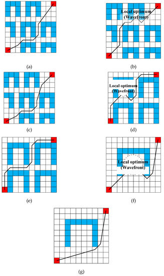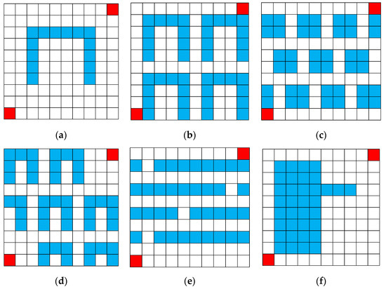 In order to test the performance under several different environments, this research uses typical environments. In this paper, three different environment sizes are used for the experiments. Figure 9 shows six environments which have 10 × 10 cells. These environments are formed archetypal patterns, such as ‘n’ shape, rectangles and slots. Environments, which have ‘n’ shape obstacle, are presented in Figure 9a,b,d. Figure 9c is a simple environment with squared obstacle and Figure 9e has slot obstacles which are known as difficult problem. The obstacle in Figure 9f is a part of environment in the paper by Karaman [44].