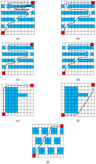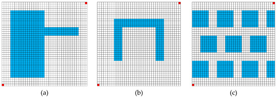 Three environments with 40 × 40 girds are presented in in Figure 11. in order to measure the different performance by network size. The environments have same shape as the environments in Figure 9a,c,f, with the only difference being that the figures are divided into smaller grids.