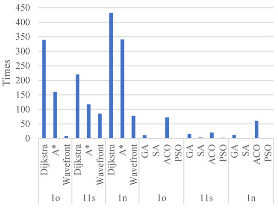 Table 10 and Table 11 show the results of experiment under 10 × 10 grid environments. The performances of metaheuristic algorithm are distinguished clearly, depending on obstacle type, the number of obstacles, and algorithms. SA takes a shorter time to solve the problem than population-based algorithms, which are GA, ACO, and PSO, but the solution quality of SA has larger fluctuations. In Table 10, some cases of reported time variances of GA and ACO are larger than others. This shows that the proposed GA and ACO have more unsettled performance than others in some cases. The algorithms have a weakness for a problem with a huge local optimum, termed the 10_4ch problem. Additionally, the larger number of obstacles, which are 10_7n and 10_11s problems, decreases the algorithm performance.