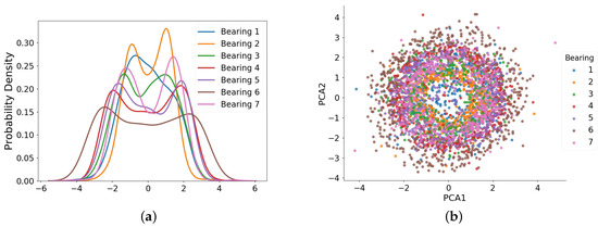 Distribution characteristics of normal state data of seven bearings from IEEE PHM 2012 Challenge dataset with (a) probabilistic density distribution and (b) feature distribution.