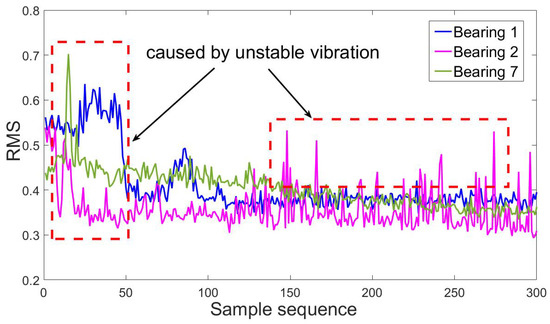 Furthermore, we also give another example. Figure 2 shows the root mean square (RMS) curves of vibration signals of the first 300 sample points of bearings 1, 2 and 7 under the first working condition. These 300 sample points can be viewed to be collected in normal state. From Figure 2, the RMS curves of bearings 1, 2, and 7 all fluctuate significantly in the starting normal state. Meanwhile, the RMS curve of bearing 2 has several peaks, which indicates that the signal is frequently disturbed. These interfered signals are not caused by bearing fault itself, but reflect the irregular vibration raised by the impact of external forces on the bearing and interference of the surrounding environment. In this scenario, the state change of bearing data is incapable of being recognized accurately and robustly, and, accordingly, such state assessment results can not support a reasonable early fault detection model. Again, the detection accuracy cannot be guaranteed and the robustness of detection model will be reduced as well.