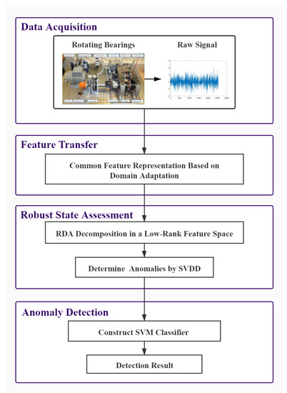 To solve such challenges, this paper presents a new robust detection method for bearing early fault. Two key ideas are adopted: (1) deep transfer learning technique is used to find out the common feature representation of bearings data in source and target domains so as to reduce the impact of data fluctuation and distribution difference; (2) On the basis of (1), outliers in the common feature space need to be further removed in order to realize an accurate state assessment, as the abnormal fluctuation part may still interfere with the common feature. The total technical flowchart is shown in Figure 3. Specifically, in the stage of feature transfer, a deep auto-encoder (DAE) model with domain adaption is applied to extract the common feature representation in bearing normal state. Then, the robust deep auto-encoder (RDA) algorithm is introduced to conduct state assessment in a low-rank space. After that, the detection model is constructed by training a SVM classifier on the state assessment results. In an online stage, the features of target bearing can be directly extracted by means of the common feature representation. By feeding them into the offline detection model, the occurrence of early fault can then be recognized.