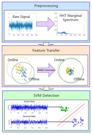 In this section, we propose a robust detection method for incipient fault. As the boundary between normal state and early fault state is generally not obvious, the proposed method firstly conducts robust state assessment on multiple training bearings by applying deep transfer learning. Using the obtained normal state data and early fault state data of training bearings, an offline detection model is established on an SVM classifier. In the online stage, by feeding each data batch of target bearing into the offline SVM classifier sequentially, we can determine whether this data batch contains an early fault or not. Here, the effect of deep transfer learning is to get a common feature representation of training bearings data in a normal state, while the robust state assessment is dedicated to obtaining as accurate a label as possible for training the SVM classifier.