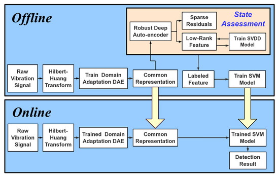 From the perspective of algorithm execution, the proposed method can be divided as an offline stage and an online stage. Note that the DAE with domain adaptation and the RDA both run in the offline stage, and the online stage only covers the detection process for target bearing which certainly belongs to the target domain. The implementation flow of the proposed method is shown in Figure 6. For sake of better understanding, we also list each step as follows.