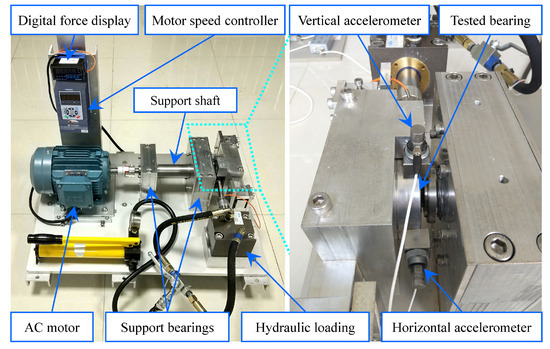 The bearing accelerated degradation test platform used in the experiment was designed by the joint laboratory and manufactured by shengyang technology. The bearing testbed is shown in Figure 8. This platform can carry out accelerated degradation experiments of various kinds of rolling bearings or sliding bearings, and obtain the monitoring data of the whole life cycle of bearings. The experimental object of the data set was LDK UER204 rolling bearing. Three kinds of experimental working conditions were designed, and five bearings were tested in each working condition. In the first condition, the engine speed is 2100 rpm and the load is 12 kN. In the second condition, the engine speed is 2250 rpm and the load is 11 kN. In the third working condition, the speed is 2400 rpm and the load is 11 kN.