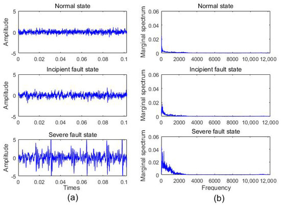 Generally speaking, fault detection can be viewed as a pre-step of fault diagnosis. Fault detection is mainly dedicated to detecting the change of system state, while fault diagnosis pays more attention to identifying different fault states such as fault type, crack size, etc. As incipient fault information is easily interrupted by noise, it is hard to determine a specific boundary between normal state and incipient fault state. Generally speaking, there are two kinds of early fault detection methods for rolling bearings: signal analysis-based methods and machine learning-based methods. For signal analysis-based methods, noise cancellation or noise utilization are usually utilized to deal with weak signal, and then time-frequency analysis is performed to extract and compare fault characteristic frequency [1,2,3]. Although such methods can extract early fault signals from original signals with noise, they still have some drawbacks: (1) If working conditions are varying or unknown, fault characteristic frequency which is used for detection could not be precisely calculated, and, consequently, the reliability and robustness of detection results would be reduced; (2) Improper denoising techniques may weaken the features of early fault, as the signals containing early fault are just of a low signal-noise ratio. As a result, these kinds of methods are perhaps insensitive to early fault and would result in delayed detection results.