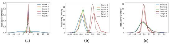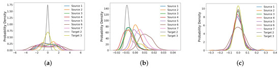 For the XJTU-SY dataset, the experimental steps are the same as the ones in Experiment 1. Due to space limitation, here we briefly provide some important results, with no detailed description of experimental process. The settings of network structure and hyper-parameters are almost identical to Experiment 1. First, we choose Target 1 in Table 2 as a test bearing while the other six bearings in source domain and target domain are as training bearings. The probability density distribution of these six training bearings in three feature spaces is shown in Figure 16.