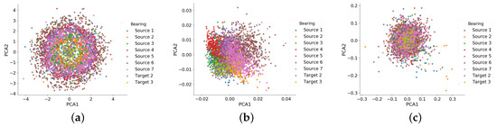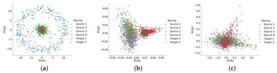 Feature distribution of six training bearings with (a) raw time signal, (b) HHT marginal spectrum, and (c) the common features extracted by domain adaptation DAE.