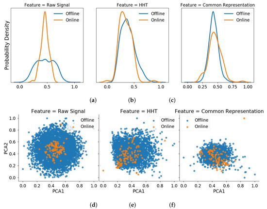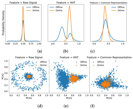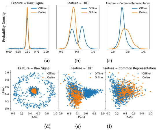 We further check the effect of transfer learning on test bearing, we choose Target 1 and Target 2 in Table 2 as the test bearing, and plot their probability density distribution in three feature spaces in Figure 18 and Figure 19, respectively. The blue line is the distribution of six training bearings for comparison, and the meaning of the legend “Online” and “Offline” are same as Figure 12 and Figure 13. Similar to Experiment 1, transfer learning can extract a more identical feature representation between two domains than the other two methods, which is definitely helpful to improve the detection performance for the bearings under different working conditions.