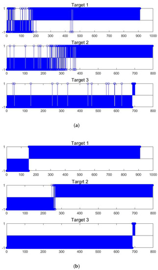 Detection results on Targets 1, 2, and 3 of Experiment 1 by using (a) SVDD and (b) the proposed method, where the label 1 and −1 represent normal state and anomaly state, respectively.