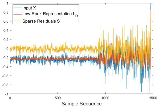 - For the common feature set X of auxiliary bearings extracted by DAE with domain adaptation, we feed them into RDA and calculate , which is the low-rank public representation of auxiliary bearing data. The specific steps to calculate are as follows [29]: