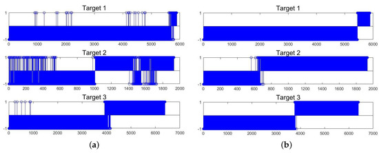 Detection results on Targets 1, 2, and 3 of Experiment 2 by using (a) SVDD and (b) the proposed method, where the label 1 and −1 represent normal state and anomaly state, respectively.