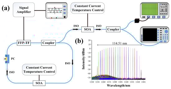 The structure of the all-fiber-ring short-cavity continuously tuned swept source is presented in Figure 1a. The semiconductor optical amplifier (SOA: Aeon SAO20r-03P31B) in the ring cavity acts as the gain medium to provide the required ASE background for the swept source. In addition to the constant-current drive circuit of the SOA, a temperature-control circuit is designed to ensure that the ASE background of the SOA can be continuously and steadily provided as the output at a constant temperature without interrupting the laser output. The isolators (ISOs: OPNETI IS-S-P-1310) at both the ends of the SOA are used to block the remaining reflected light in the cavity to protect one-way light transmission in the ring cavity. The driving signal originates from a signal generator and loads into both the ends of the fiber Fabry–Perot tunable filter (FFP–TF: LambdaQuest X767). Further, the frequency and offset voltage of the driving signal are adjusted to modulate the scanning range and speed of the filter. The voltage amplifier is designed to amplify the initial driving signal to widen the range of the filter’s transmission window because the signal generator’s maximum voltage can be only adjusted to 5 V. A polarization controller (PC: THORLABS FPC562) is used to adjust the polarization of the optical signal in the ring cavity, ensuring that the optical signal for different wavelengths can be uniformly amplified. A single-mode fiber coupler (OPNETI CP-W-P-1310) with a coupling ratio of 90:10 is used at the output end of the ring cavity to ensure that 90% of the light passes through the PC and returns to the SOA to continue resonating after filtering. Only 10% of the light passes through the SOA amplification outside the cavity and finally outputs. Following the output, a coupler converts 50% of the light into electrical signals by passing it through a high-speed photodetector (Model 1024). An oscilloscope (Teledyne LeCroy SDA 820Zi-B 20 GHz) is used to verify the output waveform in the time domain. Another 50% of the light enters the spectral analyzer (Yokogawa AQ6374) to verify the output spectrum of the swept laser.