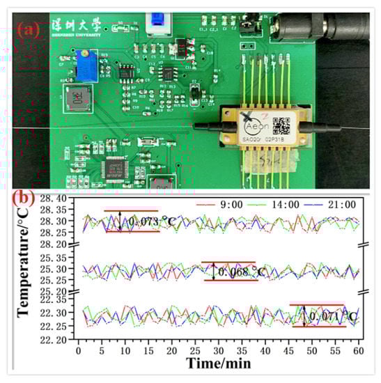 The temperature was preset to 22 °C, 25 °C, and 28 °C at different time intervals. The temperature change was verified by measurement at 9 am, 2 pm, and 9 pm every minute. Based on the experimental results depicted in Figure 2b, the average temperature drift was 0.07 °C, confirming that the temperature-control circuit provides effective temperature control for the SOA operation.