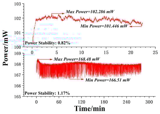 We verified the stability degrees of the optical capacity with respect to the output by applying a 980-nm wavelength from a semiconductor laser to the drive circuit. Further, the availability of the drive circuit was verified using similar practical methods. As shown in Figure 3, we separately tested the stability of the optical power with respect to the output for periods of 20 and 290 min. The stability degree and standard deviation of the optical capacity for a period of 20 min are 0.82% and 0.1438, respectively, whereas those for a period of 290 min are 1.17% and 0.28284, respectively. The designed driving circuit board of SOA ensures the stable working state of the swept source.