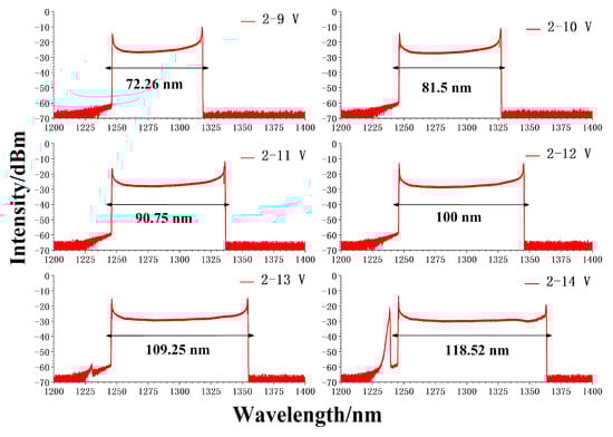 We dynamically tuned the FFP–TF, loaded the sinusoidal signal into the FFP–TF via the signal generator, and observed the influence of the peak-to-peak values of the external signal on the transmission spectrum of the swept laser when the DC bias voltage is certain to obtain a relation between the external driving voltages and the sweep output parameters. The sweep frequency was maintained constant at 50 kHz, when the DC bias of the sinusoidal signal was 2 V, the transmission spectra in the output of different peak-to-peak values were depicted as shown in Figure 4. When the DC bias voltage was fixed, the larger the peak-to-peak value, the wider was the transmission spectrum bandwidth of the swept laser and simultaneously, the output optical capacity reduced. Thus, the smaller the peak-to-peak value, the larger was the output optical capacity on the power meter. According to Figure 4, the continuous-output spectral diagrams can be obtained only when the signal tuning range loaded into the FFP–TF lies within a certain range. Otherwise, the output comprises two spectral maps with the central wavelength on one map being at a long distance from the central wavelength on the other, with specific peak-to-peak value ranges depending on FFP–TF and SOA.