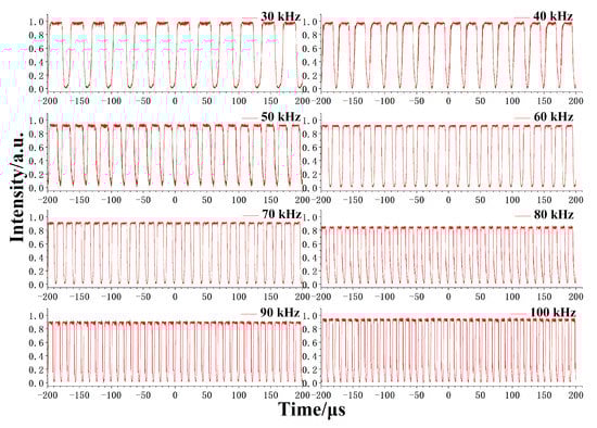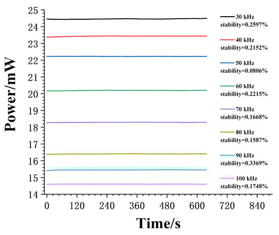 The function generator and the adjustable signal amplifier were employed to generate sinusoidal signals with appropriate parameters for driving the FFP–TF. The frequency of the sinusoidal signals begins at 30 kHz, and the maximum rated tuning speed of the FFP–TF is observed at 100 kHz. The final output of the swept laser obtained through a photoelectric detector and oscilloscope is illustrated in Figure 5. The shape of the output wavelength was improved (i.e., made more symmetrical) by amplifying the outside SOA. The stability of the optical power in the output was separately tested at each frequency (30–100 kHz). The results are displayed in Figure 6. Within 10 min, the power stability degree of each sweep speed was less than 0.34% and the swept source maintained a highly stable working state.