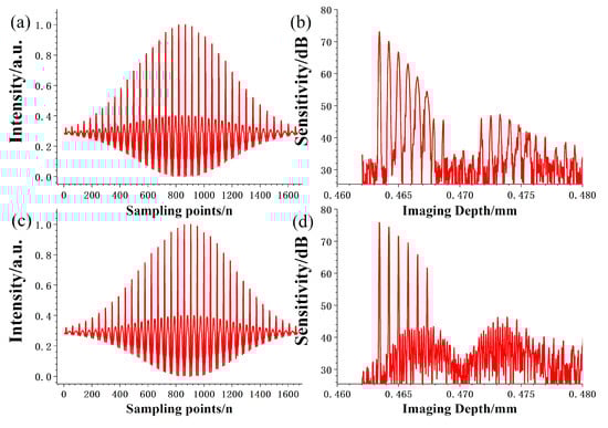 The imaging quality of the OCT system is affected by the stability, spectral region, and dispersion matching rate of each device in the system. Therefore, to construct a frequency sweep system with high imaging quality, it is critical to model each device in the system. We have established a numerical model of the SS–OCT system to address the issues of noise and dispersion in the imaging optical path. This numerical model can be used to simulate the imaging process of an actual OCT system [,]. For example, there are six reflecting mirrors in the sample. The intervals between the six reflecting mirrors are 0.5 mm, the central wavelength is 1300 nm, and the spectral bandwidth is 120 nm. Based on the low-coherence interference principle, the swept OCT system uses an optical fiber Michelson interferometer to create an interference pattern based on the light returned by both the arms in the coupler and forms an interference spectrum. The system further detects the interference spectrum information via a balanced detector for data processing and image reconstruction. Figure 7 displays the simulation results of the SS–OCT system. Figure 7a,b denote the uniform distribution of the wavelength with time, whereas Figure 7c,d denote the uniform distribution of the wavenumber with time. Furthermore, Figure 7a,c demonstrate the interference signal obtained from the balanced detector. The sample depth coordinate, d and the wavenumber space, K constitute a Fourier transform pair. Thus, the transformation from the wavenumber space to the depth coordinate can be realized via Fourier transform. Figure 7b,d provide the point spread function of six points of the sample from which the axial resolution of the system can be measured. The mirror peak will not broaden with an increase in depth when the wavenumber is uniformly distributed with time. However, the mirror peak width will increase with the increasing depth of the sample, i.e., the resolution will decrease, when the output wavelength is uniformly distributed with time. This system is potentially applicable to imaging experiments with respect to biological tissues and other samples. It may also collect data from biological tissues for processing and reconstructing the two-dimensional cross sections in the depth direction.