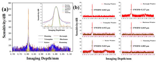 The envelope shape of the interference spectrum affects the imaging resolution ratio of the system. In particular, it affects the imaging ability of the system. The output spectrum of the swept source does not follow a Gaussian distribution. We can effectively improve the system’s resolution ratio and enhance its imaging quality by introducing a window function that shapes the spectrum and reduces the interference caused by the sidelobe [,,]. A suitable window function was applied to the interference spectrum before the Fourier transform step to reduce the interference caused by the sidelobe and improve the image contrast. Different window functions exert different effects on the signal spectrum because they result in different leakage sizes and exhibit different resolving powers. As the windowing processing is performed on signals, the selected window function must be compatible with the signal properties and research objectives. The effects of window function on the spectral shape were evaluated using a plane mirror sample. Further, the interference spectral signal data were processed using several common window functions. The interference spectra obtained after spectral shaping in the simulation experiment are shown in Figure 8. In principle, the selected window function should maximize the amount of information and eliminate the integrated effect of the sidelobe. Therefore, the main lobe width in the window function frequency spectrum should be narrowed as far as possible to reduce the full width at half maxima (FWHM).