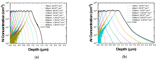 Simulated depth profiles of (a) nitrogen for N+ junction and (b) aluminum for P+ junction