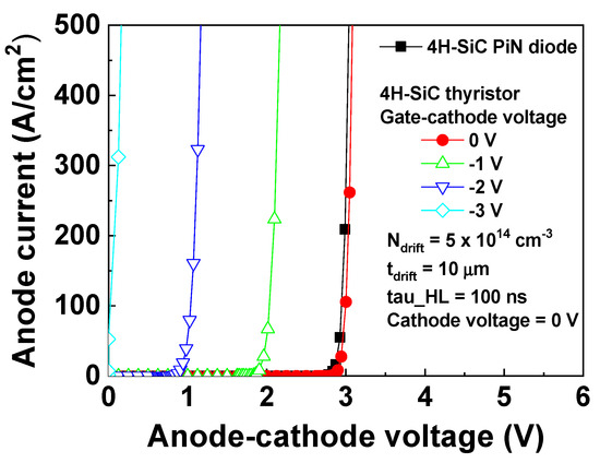 Simulated anode current of the 4H-SiC thyristor for various gate-cathode voltages from 0 to −3 V. The doping concentration (Ndrift), thickness (tdrift), and high-level injection carrier lifetime (tau_HL) were 5 × 1014 cm−3, 10 μm, and 10−7 s, respectively.