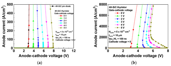 The electrical characteristics of the 4H-SiC thyristor were investigated. The anode voltage was swept in the positive direction after the gate voltage was incremented to a target value. The cathode voltage was zero. The snapback of the thyristor was defined as the anode voltage at which the resistance of the I–V characteristics changed from a positive value to a negative one. Figure 3 shows the simulated anode current of the 4H-SiC thyristor as the gate voltage was varied from 0 to −3 V. The concentration, Ndrift, was 5 × 1014 cm−3 and the thickness, tdrift, was 10 μm. The current-voltage characteristics of the 4H-SiC pin diode formed at the P+ anode/P-drift/P buffer/N+ cathode junctions were also included. The doping concentration and geometry of the pin diode and thyristor were the same when the N base, N+ gate, and gate were not considered in the pin diode. Lower gate voltage resulted in a forward-biased P+ anode/N+ gate junction at lower anode voltage. Therefore, as the gate voltages decreased from 0 to −3 V, the anode current-anode voltage characteristics shifted in the negative direction. The thyristor Vf at 100 A cm−2 were 2.99, 2.05, 1.05, and 0.06 V at the gate voltages of 0, −1, −2, and −3 V, respectively. We also increased the gate voltage from 0 to 5 V as shown in Figure 4. The snapback was clearly seen in the anode current-voltage characteristics under the high current-density scale. When the gate voltage increased from 0 to 5 V, the anode current-voltage characteristics shifted in the positive direction. The thyristor snapback voltage for gate voltages of 0, 1, 2, 3, 4, and 5 V was 2.9, 3.9, 4.9, 5.9, 6.9, and 7.9 V, respectively. The gate voltage determined the PNP BJT base voltage, and the BJT could be turned on with the low gate voltage. The high gate current from P+ anode to N+ gate enhanced the regenerative action of the thyristor. This also decreased the thyristor Vf. We also considered the built-in potential of the PN junction. The Si and 4H-SiC PN junction potential was approximately 0.7 and 3 V, respectively, because the band gap of Si and 4H-SiC is 1.12 and 3.26 eV, respectively.