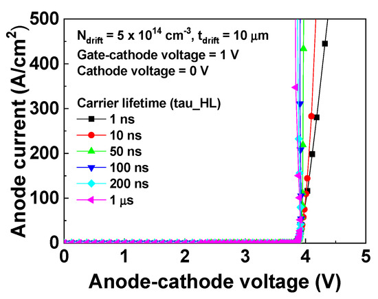 The carrier lifetime was crucial to the thyristors for conductivity modulation during on-state. The forward anode current of the 4H-SiC thyristor with the carrier lifetime from 10−9 to 10−6 s is shown in Figure 5. The increase of the carrier lifetime increased the on current due to the enhanced conductivity modulation. We also compared the forward I–V characteristics with or without incomplete ionization [39]. As expected, the incomplete ionization model (INCOMPLETE) lowered the doping concentration and increased the Vf at 200 A cm−2 from 3.92 to 3.99 V at 300 K.