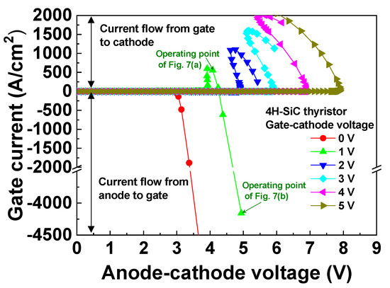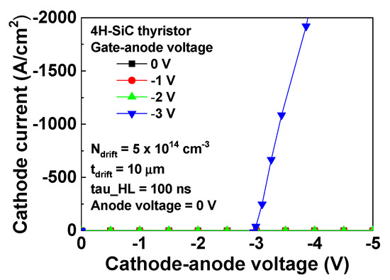 We also simulated the cathode current-cathode voltage characteristics as shown in Figure 8. The cathode voltage was swept in the negative direction after the gate voltage was changed to a target value. The anode voltage was zero. The gate voltage of −3 V caused the forward biased P+ anode/N+ gate which induced the current drive of the PNP BJT and thyristor, respectively. When the gate voltage was −2, −1, or 0 V, the 4H-SiC thyristor cannot be triggered.