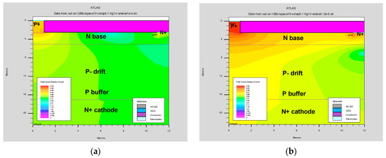 The gate current-anode voltage characteristics include the on-state current flow when a pulsed gate current is used to turn on the device. Figure 6 shows the simulated gate current of the 4H-SiC thyristor as the gate voltage was varied from 0 to 5 V. For zero gate voltage, the gate current was negative as the anode voltage was increased, which indicates a significant current from the P+ anode to the N+ gate to bring the thyristor into conduction mode. In contrast, a positive gate current represents carrier injection from the N+ gate to the P-drift region of the NPN BJT. This current indicates that the positive gate voltage prevents triggering the regenerative action of the thyristor. The decrease in the gate current from the P+ anode to the N+ gate increased both the snapback voltage and Vf. The current flow was verified, as shown in Figure 7. The scale colors indicate the total current density in logarithmic scale. The two operating points of Figure 7 are also included in the gate current-anode voltage characteristics shown in Figure 6. A 1 V bias was applied to the device gate, and a vertical current flow was observed from gate to cathode for an anode bias of 4.08 V, as shown in Figure 7a. The lateral current flow from anode to gate for a 4.94 V anode bias is shown in Figure 7b.
