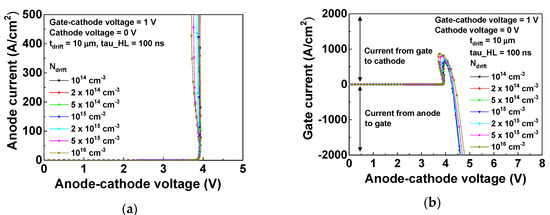Simulated (a) anode current and (b) gate current of the 4H-SiC thyristor for various P-drift (Ndrift) doping concentrations. The thickness of the P-drift region (tdrift), gate-cathode voltage, and high-level injection carrier lifetime (tau_HL) were 10 μm, 1 V, and 10−7 s, respectively.