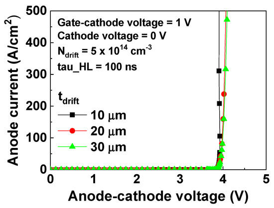 Simulated anode current of the 4H-SiC thyristor for various thickness of P-drift region (tdrift). The doping concentration (Ndrift), gate-cathode voltage, and high-level injection carrier lifetime (tau_HL) were 5 × 1014 cm−3, 1 V, and 10−7 s, respectively.
