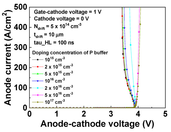 Furthermore, we investigated the anode current of the 4H-SiC thyristor for several tdrift, as shown in Figure 10. Ndrift and gate voltage were fixed at 5 × 1014 cm−3 and 1 V, respectively. The Vf at 200 A cm−2 for tdrift of 10, 20, and 30 μm was 3.92, 4.01, and 4.03 V, respectively. An increase in tdrift can improve the breakdown voltage of the 4H-SiC thyristor, but also results in an increase in Vf. Figure 11 shows the simulated anode current of the 4H-SiC thyristor for various P buffer doping concentrations. When the P buffer doping concentration was 1015, 1016, and 1017 cm−3, the Vf at 100 A cm−2 was 3.65, 3.71, and 3.99 V, respectively. The increase in P buffer doping concentration enhanced recombination at the NPN BJT base and increased Vf. This also affects the electric field distribution under reverse bias, as well as the breakdown voltage and switching speed.
