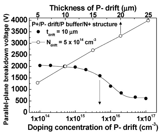 Simulated parallel-plane breakdown voltage of P-drift/P buffer/N+ cathode for several P-drift doping concentrations (Ndrift) and thicknesses (tdrift). The doping concentration of the P buffer was 3 × 1016 cm−3.