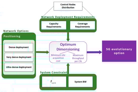 Radio planning is an essential task for wireless networks that mainly refers to calculating the number, location and configuration of the radio network nodes. In the early days, since no prior network infrastructure existed, this task considered only the estimation of the number of base stations (BSs) and their locations, i.e., the BS location problem [,,,]. In addition, for early cellular networks, radio network planning was split into two separate tasks: coverage and capacity. Nevertheless, as it was shown in several publications (e.g., [,,]), capacity and coverage planning are not un-correlated. On the contrary, they are inter-related in 3G, 4G and now 5G wireless networks and hence, they must be treated together.