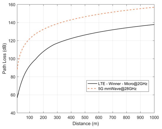 The propagation losses of this model vs. distance for f = 28 GHz are depicted in Figure 2 along with the losses of the WINNER model for microcells at the 2 GHz band of LTE [].
