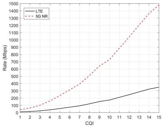 Rate calculations for an LTE-A system with 20 MHz bandwidth and five aggregated component carriers compared to the 5G NR system employed in this work.