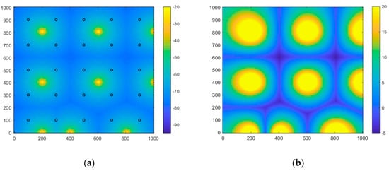 Uniformly distributed CNs in the service area represented the area coverage and capacity criterion. An initial throughput requirement was allocated at each CN, which gradually increased. At relatively low capacity requirements, microcells with omnidirectional antenna patterns were uniformly placed by the optimization algorithm, as seen in Figure 4a, in order for each microcell to serve all neighbor CNs (shown in Figure 4a with black stars). The SINR distribution (Figure 4b) also followed this regular pattern. Note that although the received power fell sharply with distance due to the relatively high frequency, the SINR did not fall as rapidly due to the equivalent reduction of the interference from other cells.
