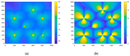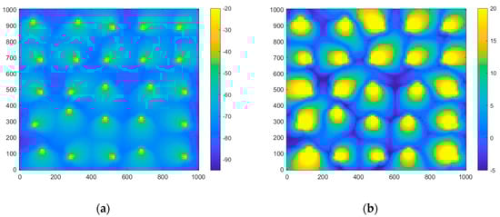(a) Received power (dBm) and (b) SINR distribution in the service area for a dense omnidirectional micro gNB deployment.