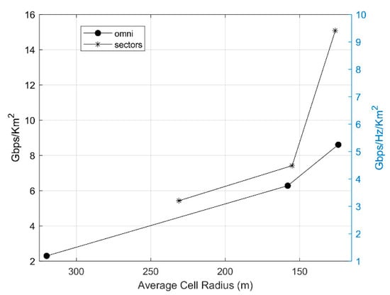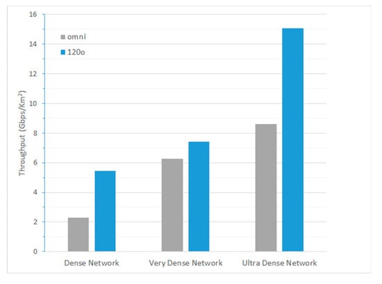 Overall, comparing the performance of the various network configurations that resulted from the optimization algorithm, it was evident that the denser the microcell deployment, the higher the area throughput (see Figure 7). Moreover, with tri-sector microcells, the throughput almost doubled at the ultra-dense networks with respect to that of dense networks, either with omnidirectional or sector antennas. At these scenarios, as seen in Figure 6, most of the times each microcell had only one sector antenna operating and hence, the advantage with respect to the omnidirectional deployment was due to interference reduction to adjacent cells.