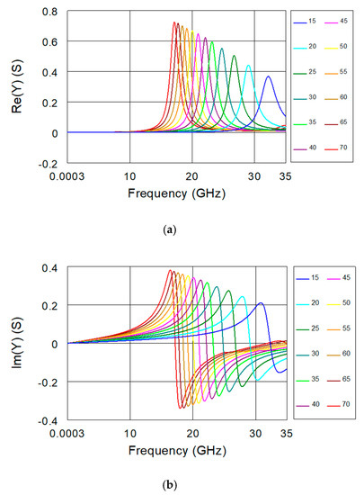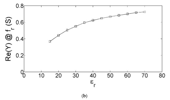 When the frequency reaches fr, Re(Y) should exhibit a peak equal to the inverse of R1 and Im(Y) should become equal to zero. The admittance of the sensor can be modeled by using only the R1L1C1 network at the resonant frequency, since this network reduces to only R1 that is then connected in parallel to the rest of the circuit having a larger impedance. Nevertheless, this resonance of the R1L1C1 series was not observed in the FEM simulations of the pure IDC sensor [39], since both Equation (3) based on only the R1L1C1 network and the five-element equivalent-circuit simulations show that the resonance occurs at 70.7 GHz which is far beyond the upper frequency limit of the FEM simulations. In the present study, the real part of the relative permittivity of the MUT is increased enough to make the resonance observable, by exploiting the fact that a higher εr leads to a larger C1 and, consequently, smaller fr (see Equation (3)). A higher εr implies a larger C1, since this element represents the capacitive coupling of the multi-finger structure through the quartz substrate and air for the pure IDC sensor but, when a MUT is placed on top of the sensing area, the capacitive coupling through the MUT should be taken into account in the estimation of C1. As illustrated in Figure 3, the sensor resonant frequency can be defined as the frequency at which the admittance has a peak in the real part and zero imaginary part. The FEM simulations show that, by increasing the real part of the relative permittivity of the MUT, the resonant frequency shifts towards lower values and, in addition, the peak in Re(Y) becomes progressively higher. The achieved results are illustrated in Figure 4. The observed reduction of the resonant peak in Re(Y) at lower εr might be correlated to the skin effect of the metallization of the multi-finger structure [50], implying an increase of the resistive contributions at higher frequencies.