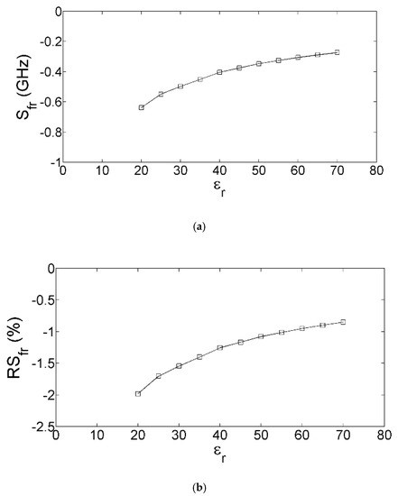 As should be expected from the fact that fr decreases with increasing εr, both Sfr and RSfr are negative and their magnitudes are reduced with increasing εr (see Figure 5). Sfr reaches its maximum magnitude of 0.638 GHz/Δ1 when εr is 20, implying that a variation in εr value of 5 can be detected as a variation in fr value of 3.19 GHz.