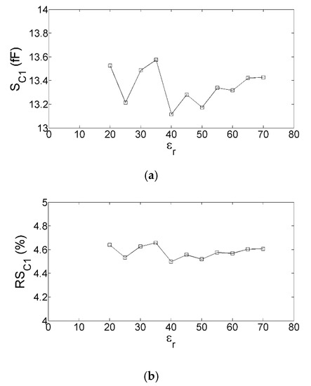 As should be expected from the fact that C1 increases linearly with increasing εr, both SC1 and RSC1 are positive and practically insensitive to εr (see Figure 7). The average values of SC1 and RSC1 are 13.35 fF/Δ1 and 4.58%, respectively. The good linear relationship between C1 and εr implies that the average value of SC1 is almost equal to the slope of the approximating straight line (i.e., 13.37 fF).