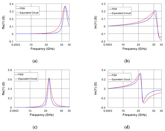 FEM (blue lines) and equivalent-circuit (red lines) simulations of the real and imaginary parts of the (a,b) impedance and (c,d) admittance from 0.3 MHz to 35 GHz for the IDC sensor loaded with lossless MUT having a real part of the relative permittivity of 70.