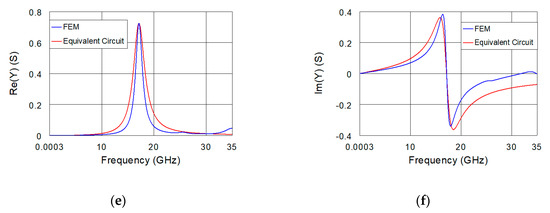 To estimate the discrepancies between FEM and equivalent-circuit simulations, Figure 12 shows the frequency dependence of the difference between FEM and equivalent-circuit simulations of the real and imaginary parts of the admittance for the case with a real part of the relative permittivity of 70. As can be observed, although the use of the modified broadband model enables reduction of the discrepancies over the extremely wide frequency range, the local model can keep discrepancies very small locally around the resonance in the admittance.